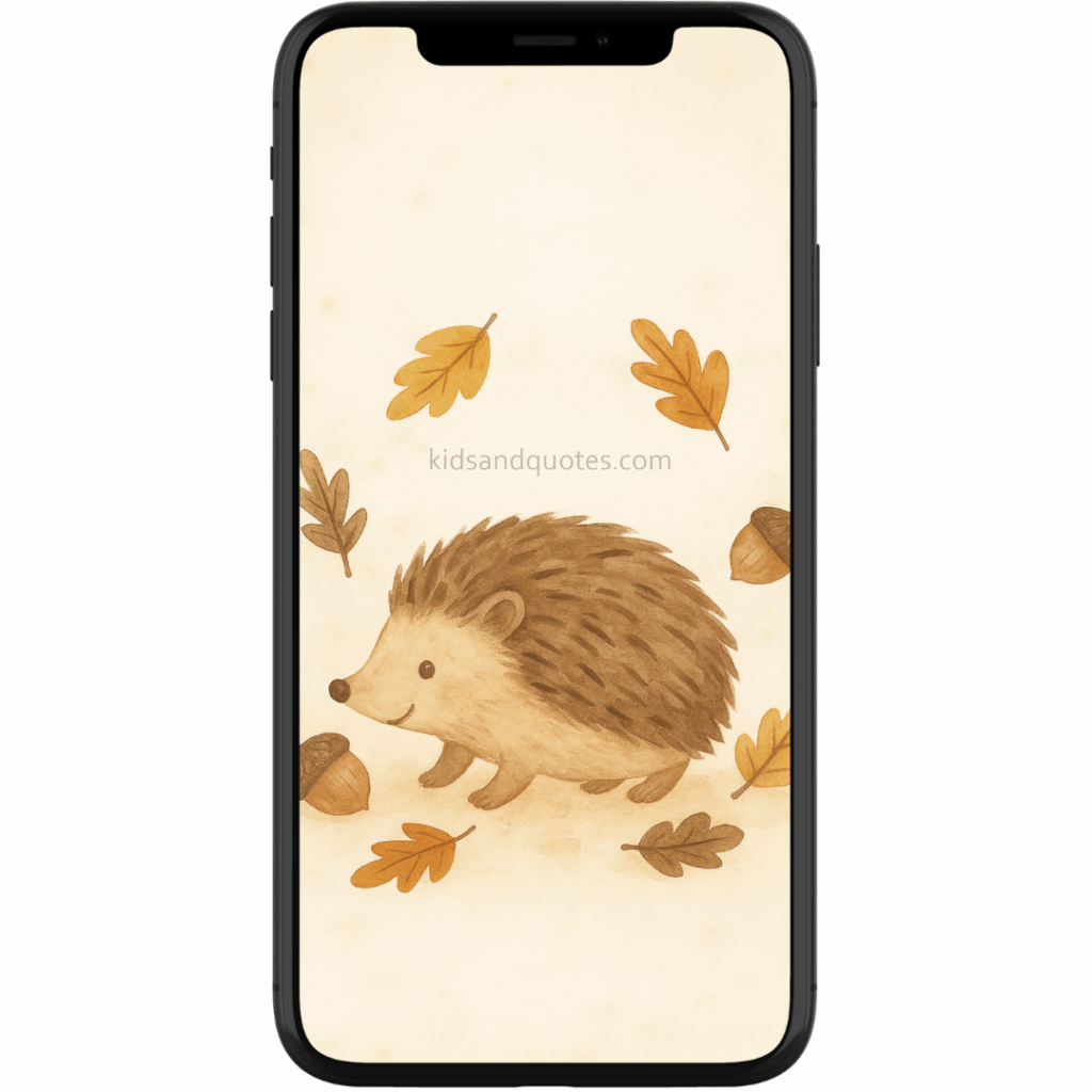 A small hedgehog curled or walking, with leaves and acorns around it, in a sketchy/watercolor style, warm earthy palette.