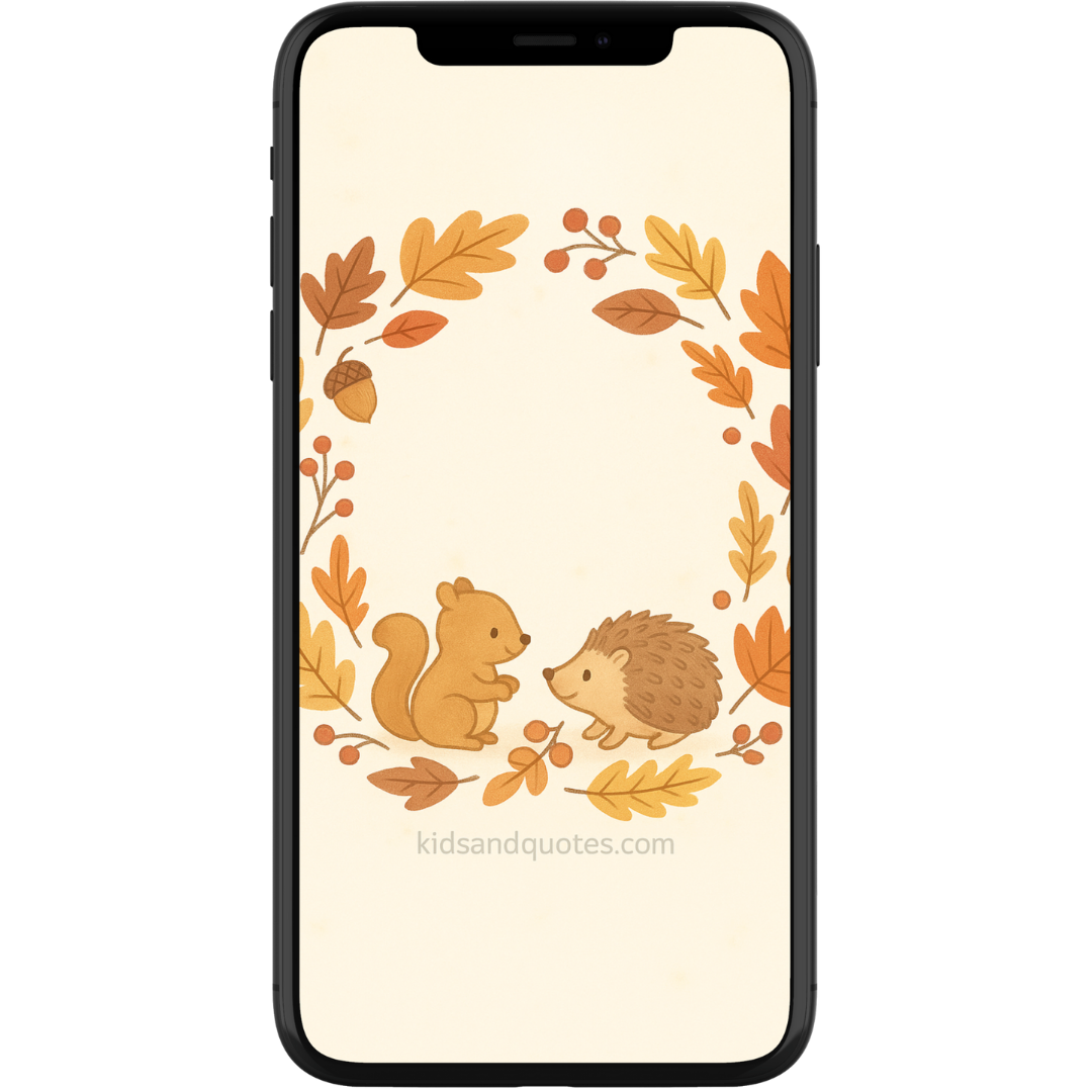 A circular wreath of autumn leaves (maple, oak), interspersed with small berries, acorns, and two small animals (e.g. squirrel + hedgehog) peeking inwards, against a clean backdrop.